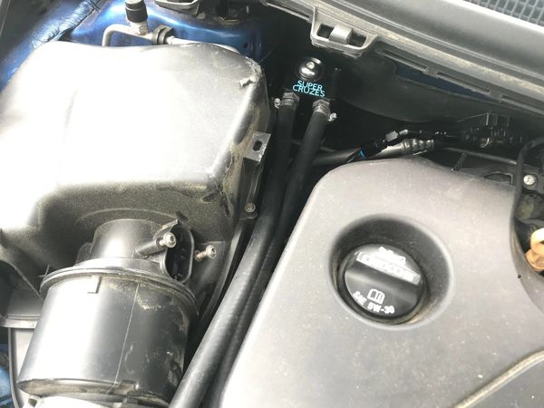 This is a picture of the catch can system in place with the catch can mounting cup installed next to a cold air intake. This is an area that is typically not used for anything if you have an aftermarket air intake. This allows access for the catch basin to be removed and drained. This kit is hand made by me. I start with a generic catch can system and modify it to work properly on the second generation CRUZE.